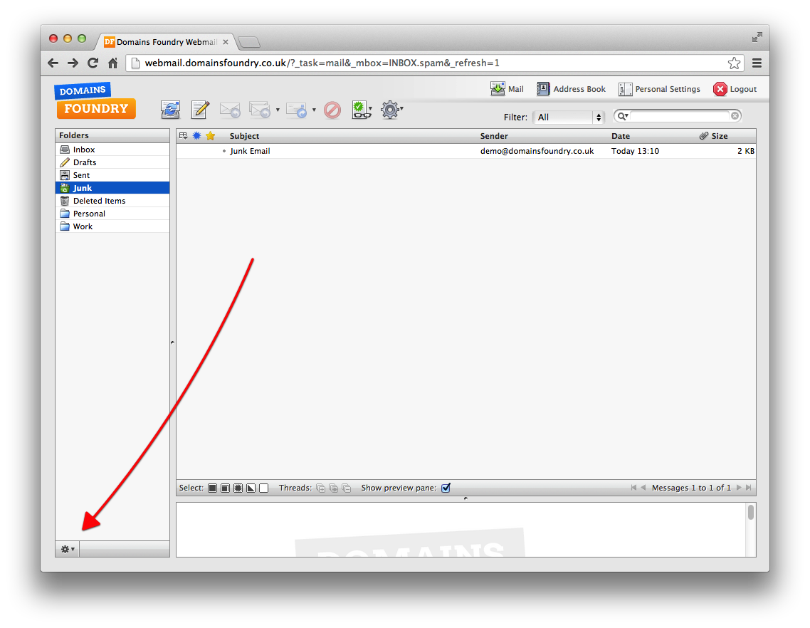 Select your DomainsFoundry Webmail Junk Folder. Click the Folder Actions button. - Click Empty