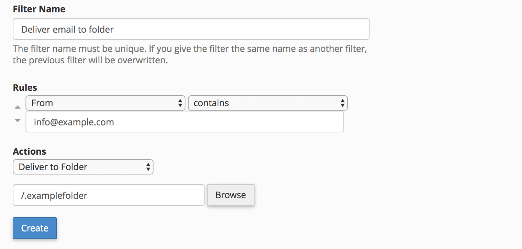 - Configure your filter’s rules and actions. For detailed information on how to configure your filter please see cPanel’s How to Configure Mail Filters article.