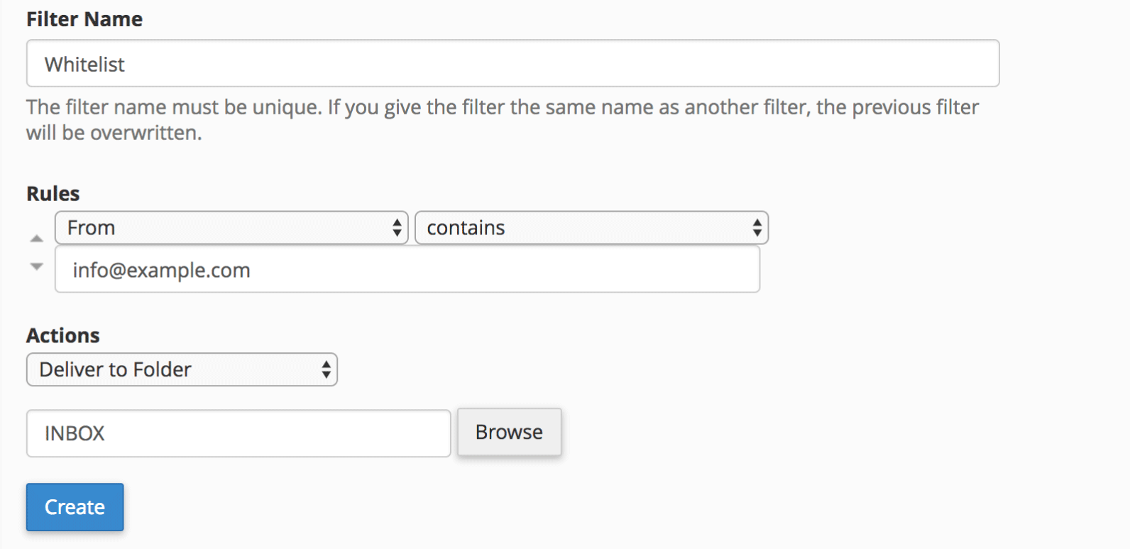 We’ve included some examples of filter rules below. Replace info@example.com with the email address you wish to filter.