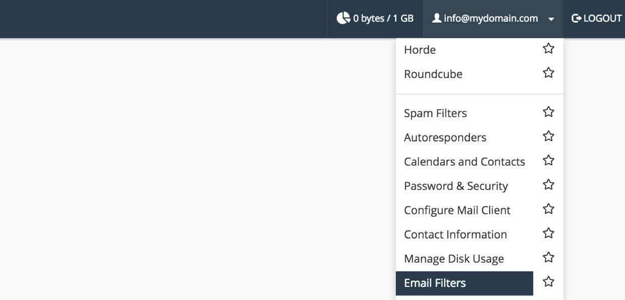 - Click the username dropdown-menu at the top right then click Email Filters.